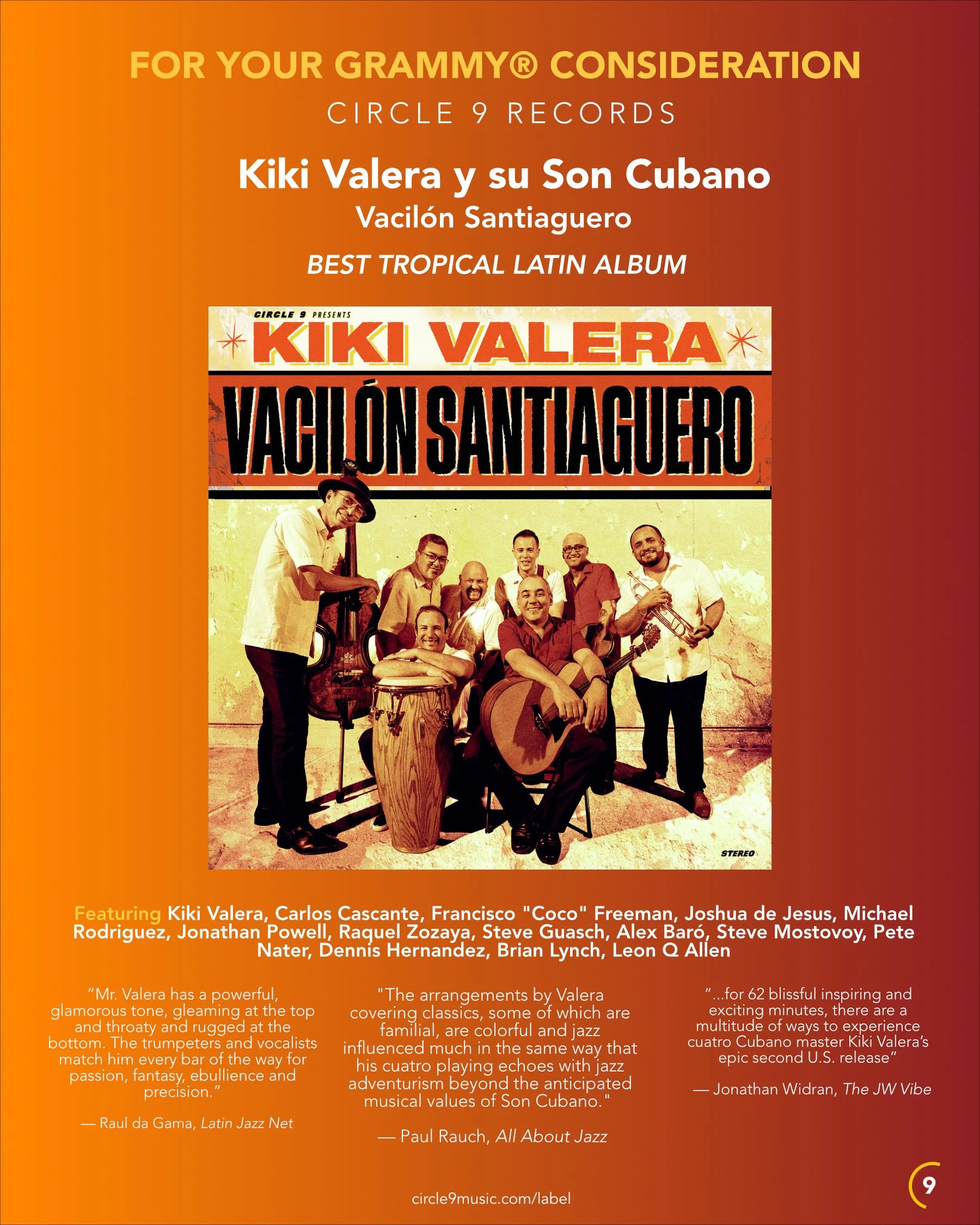 Circle 9 Records has two amazing projects submitted to the first round of the 67th Grammy® Awards; Jonathan Powell’s “Mambo Jazz Party”, and Kiki Valera’s amazing son cubano project, “Vacilón Santiaguero”.